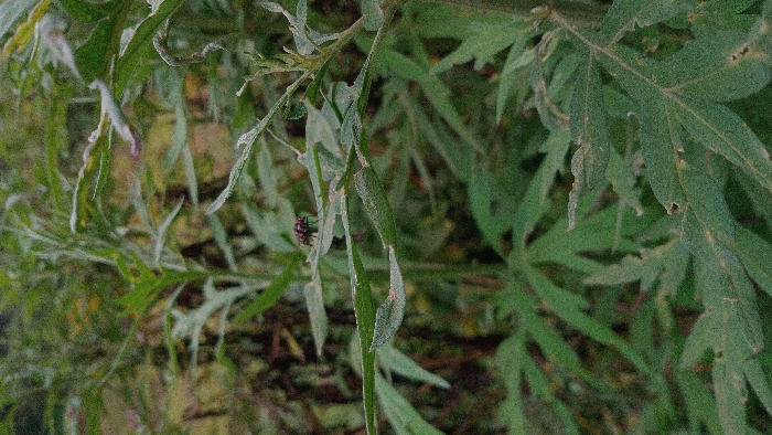The scene, located in Gesima ward, Kenya, displays dense green foliage. A small, dark-bodied insect, exhibiting iridescent reddish-purple segments, is stationary on the upper surface of a serrated green leaf positioned in the upper-middle of the vertical frame. Surrounding this central subject are multiple green plant leaves of various shapes and shades, some showing minor surface irregularities or damage. The background consists of out-of-focus green vegetation. No human subjects or artificial structures are visible.