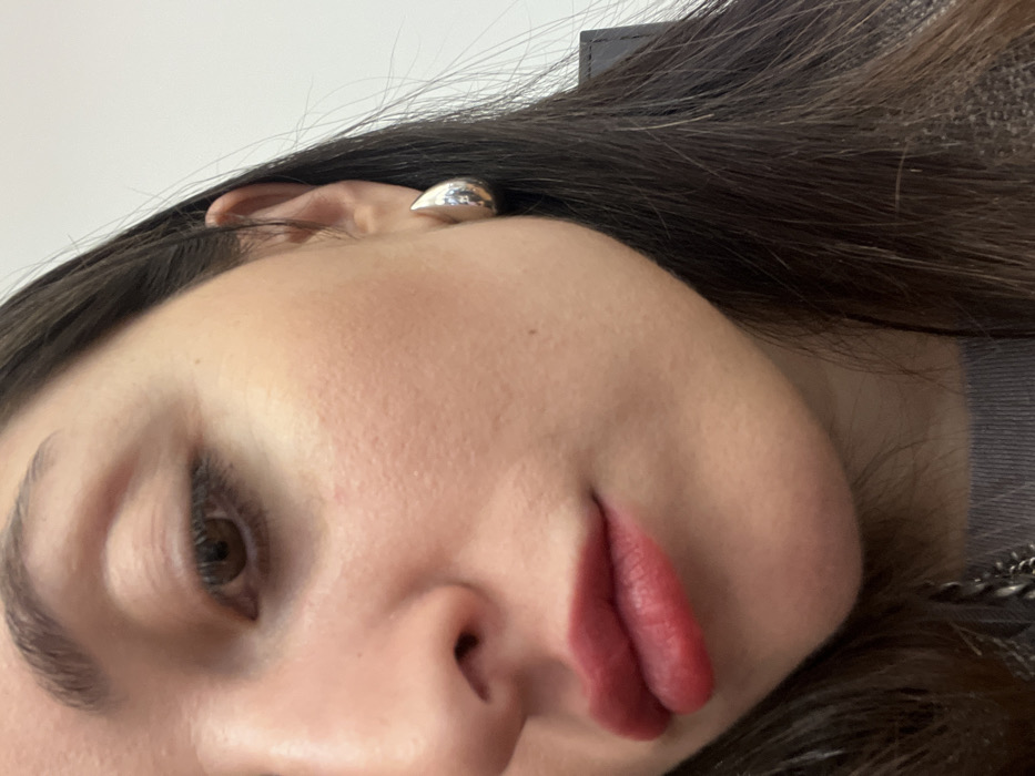 The image presents a close-up, partial portrait of an individual, likely female, focusing on the right side of the face. The subject has fair skin with visible pores and dark brown hair, which appears long and falls along the right side of the face. The right eye, with a brown iris, is partially closed or directed downwards, framed by a shaped eyebrow. The lips are adorned with red or deep pink lipstick. A silver-colored, teardrop-shaped stud earring is present on the right earlobe. A chunky, silver-colored chain or necklace is visible at the base of the neck, over a grey garment. In the background, behind the subject's right shoulder and hair, a dark, possibly leather, object is partially visible. The immediate background behind the head is a plain, light-colored surface, indicative of an indoor environment. There are no visual cues within the image to determine the location as Heilbronn, Germany, or any other specific geographical area.