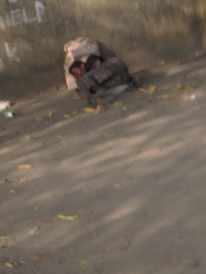 Against a weathered wall bearing the faded word "HELP," a person huddles next to a sack. Their head rests against it, and they are partially wrapped in a dark, patterned cloth. The ground is littered with debris, including scattered leaves and small trash. Overlapping shadows fall across the scene, and the image is blurred, obscuring fine details. The overall atmosphere conveys a sense of vulnerability and desolation.