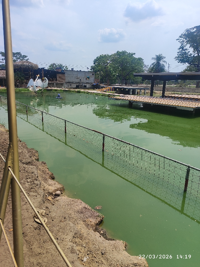 This image presents an outdoor scene in Tocuyito, Venezuela, centered on a large, green-tinted body of water, likely a pond or artificial lake. In the immediate foreground, an uneven dirt bank with exposed soil slopes down to the water's edge. A gold-colored metallic vertical support structure is partially visible on the far left. A low chain-link fence, comprising dark mesh and vertical posts, some with red-colored caps, extends horizontally across the image, running along the water's surface near the left bank. Within the water, toward the left side, two white, stylized swan sculptures are positioned, depicting them with raised wings. To the right of the swans, a dark, cylindrical submersible object, possibly a pump or aerator, is visible just above the water's surface. Along the far bank of the water, several structures are evident. On the left, a building with a thatched roof and visible wooden beam supports stands near the water. Adjacent to this, a partially constructed or unfinished building with exposed brick and concrete walls is visible. Further to the right, a large, covered deck or pier extends over the water. This structure features a dark, flat roof supported by dark vertical columns, and its deck surface displays a light-colored, possibly tiled or patterned finish. The background consists of various trees and vegetation under a bright, partly cloudy sky. No individuals are present in the scene. A digital timestamp "22/03/2026 14:19" is embedded in the bottom right corner of the image.