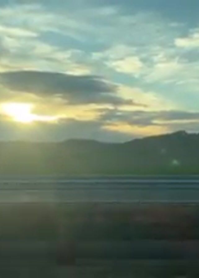 The video depicts a scenic view from a moving vehicle, possibly a car or train, on a road adjacent to a field with hills and trees in the background. The sky is predominantly blue with scattered clouds, and the sun shines brightly through them, creating a radiant glow with visible sunbeams. A road barrier runs alongside the road, and a dark strip of grass is visible in the foreground. The overall scene conveys a sense of travel and natural beauty under a partially cloudy sky at a time of day when the sun is low.