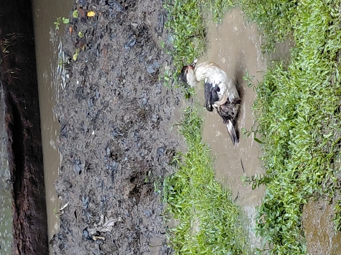 A Muscovy duck stands in muddy water near lush green vegetation. The duck's plumage is predominantly white with dark accents on its back and tail. The area surrounding the duck features damp earth and a brown, wooden structure. The vegetation is vibrant, contrasting with the muddy environment.