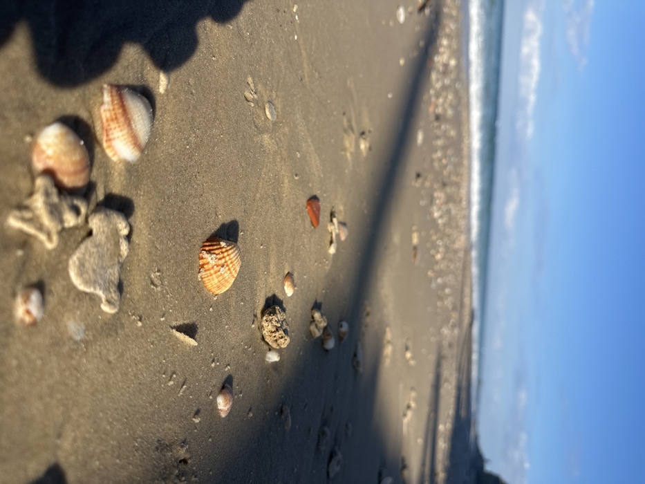 The image displays a low-angle perspective of a sandy beach in Herzliya, Israel, along the Mediterranean coast. The foreground consists of tan-colored sand interspersed with numerous seashells, shell fragments, and small pieces of rock or coral. A prominent orange and white striped bivalve shell rests in the mid-foreground, slightly right of center. Another bivalve shell with distinct white and orange stripes is visible in the bottom-left corner. A large, dark, elongated shadow, likely belonging to the photographer or an nearby object, extends diagonally from the bottom-left toward the center. In the mid-ground, the sand continues with more scattered shells, becoming less distinct with distance. The background features the expanse of the blue Mediterranean Sea with small, white-crested waves breaking on the shore. Above the sea, a clear, bright blue sky is visible, dotted with a few wispy white clouds. A faint landmass, possibly a coastal bluff or dune, is discernible on the far right horizon. No human figures are explicitly visible. The scene is illuminated by natural daylight, casting clear shadows.