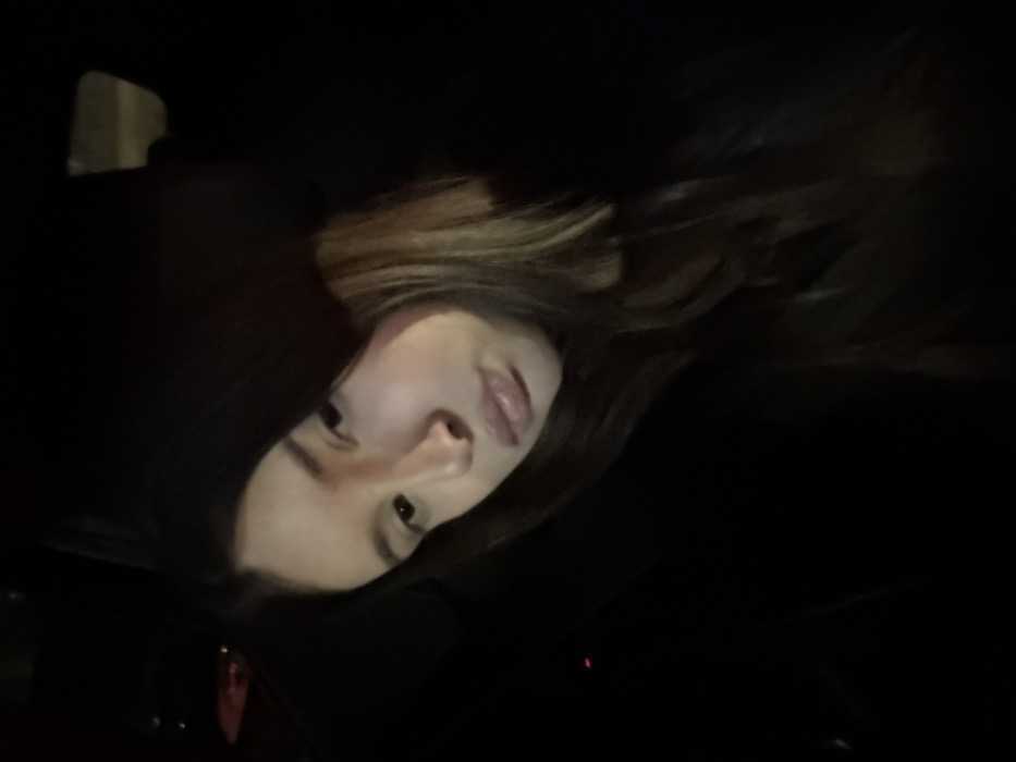 A woman with light skin and long, wavy hair, partially highlighted blonde, is visible. Her face is angled slightly towards the viewer, with dark eyes and full lips. The background is predominantly dark, with indistinct shapes suggesting an interior space or a vehicle. A section of dark fabric, possibly clothing, is also visible. The lighting is low, casting shadows across the scene.