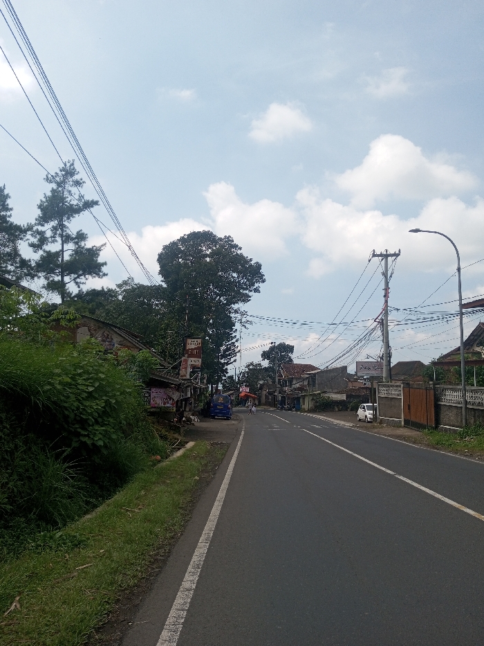 The scene depicts a straight asphalt road extending into the distance under a blue sky with scattered white clouds, located in Niz Lakuk, India. The road features a solid white shoulder line on the left and a dashed white center line. On the left side of the road, an elevated grassy bank with dense green foliage runs alongside a concrete ditch. Beyond the bank, multiple structures, including small shops or residences, are visible. One prominent building displays an aged mural and multiple signs, one of which indicates "DISCOK LAT M NATA". A blue van is parked near these structures. Tall pine-like trees and other broadleaf trees are present on the left, with numerous utility lines strung overhead. On the right side of the road, a white compact car is parked on the shoulder, followed by a concrete fence with a brown wooden gate. A utility pole heavily laden with wires stands on the right, alongside a modern streetlight. In the distant midground, indistinct figures, possibly two individuals on bicycles or motorcycles, are observed moving away from the camera. Additional residential buildings line both sides of the road in the background.