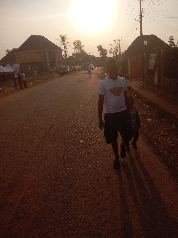An outdoor scene in Igbenu, Nigeria, depicts a reddish-brown road at what appears to be dusk or dawn, illuminated by a low-angle sun prominent in the upper right. In the immediate foreground, a male adult wearing a white t-shirt with an orange design and dark shorts, along with dark sandals, walks forward, slightly right of center. A small child, mostly obscured by the man's right leg, walks closely behind him, wearing a dark long-sleeved top. Both cast elongated shadows towards the lower left. To the left, a two-story building with a dark sloped roof and light-colored walls is visible, situated behind white tents with red banners. Several individuals are gathered near these tents. Multiple vehicles are parked further down the road on the left side. On the right side of the road, a utility pole with power lines stands. Adjacent to it is a single-story building with a dark, possibly thatched roof and brown walls, featuring a visible sign or billboard. Various trees and sparse vegetation punctuate the landscape in the midground and background. Additional distant figures are present along the road. The sky exhibits a warm, bright glow around the sun.