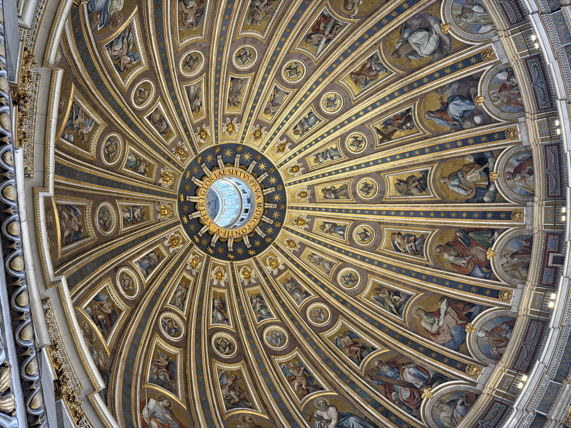 detailed view looking upwards at the interior dome of St. Peter's Basilica in Vatican City. The dome is intricately decorated with mosaics and gilded elements, arranged in a radiating pattern. The central oculus allows natural light to enter. The inscription around the oculus reads "S. PETRI GLORIAE SIXTVS V P.M.A.D.XC. PONTIF. V," which honors Pope Sixtus V. Various religious figures and scenes are depicted in the mosaic panels, including angelic figures and scenes from the life of Jesus. The overall impression is one of grandeur and artistic detail, typical of Renaissance and Baroque architecture.