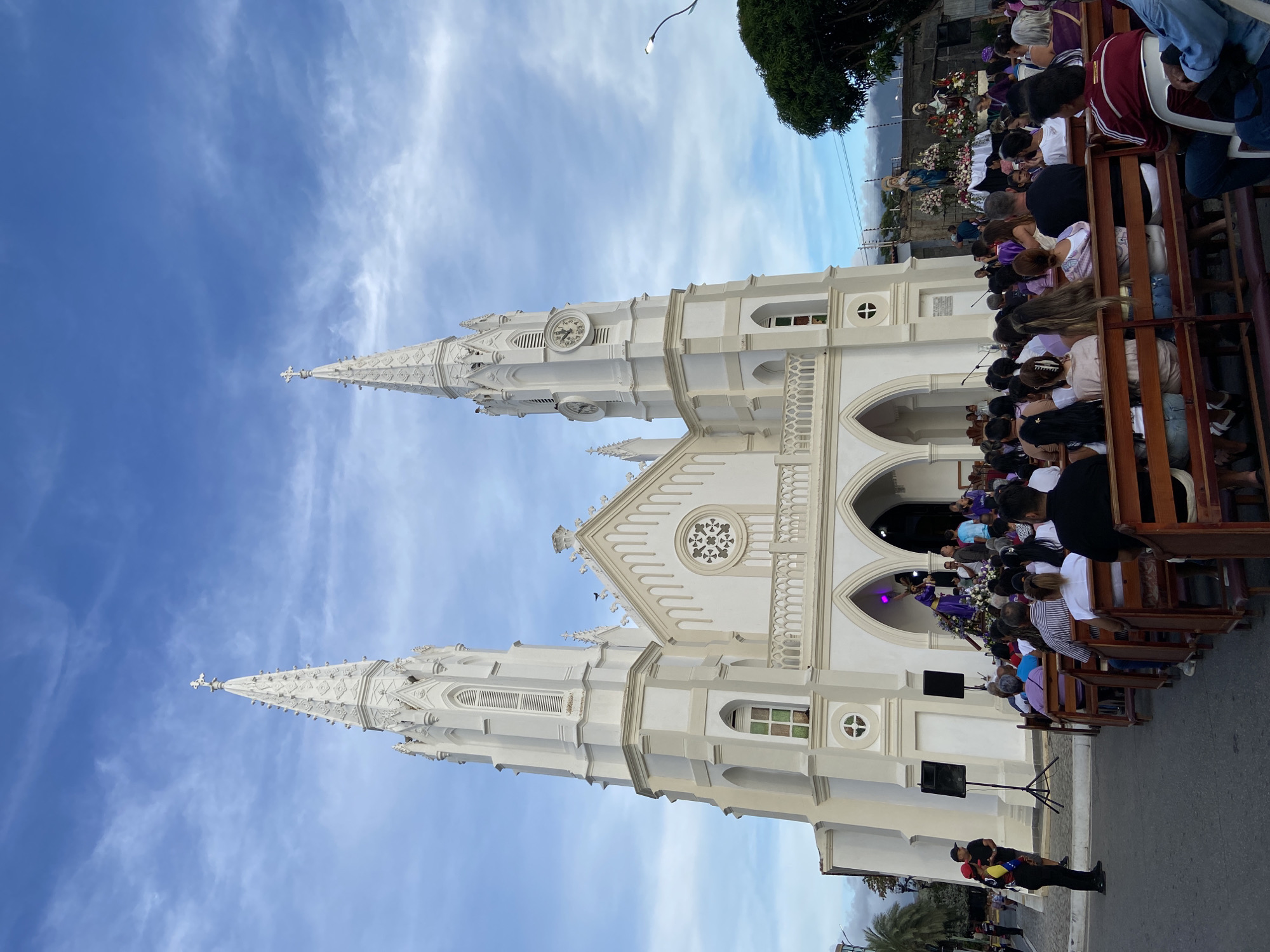 - "A medium shot shows a church exterior in Juan Griego, Venezuela, with two tall, white towers rising against a blue sky with streaky clouds" by FM-H5MsC3, licensed under CC BY 4.0