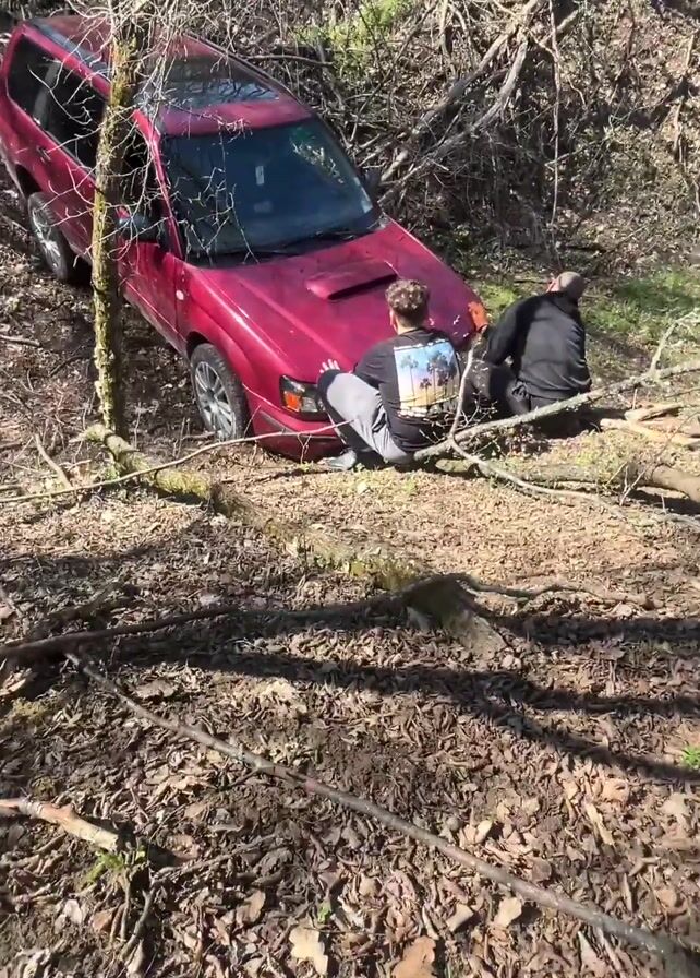 A red Subaru Forester is stuck in a wooded area. Two people are attending to the vehicle. One person is squatting in front of the car near the hood, and the other person is sitting on the ground behind them. The car is partially obstructed by small tree branches and appears to be on a slight incline covered with leaf litter. Sunlight dapples through the trees. The engine of the car is audible.
