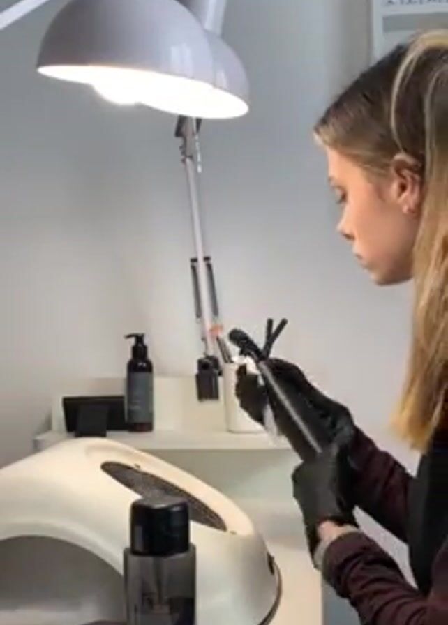 In a nail salon-type setting, a woman wearing black gloves is wiping down a black handheld device with a white cloth. She stands at a white desk with a lamp overhead, nail polish bottles in the background, and a nail curing lamp to her left. The woman is fair-skinned with blonde hair. The handheld device has a nozzle on one end. She is focused on cleaning the device.