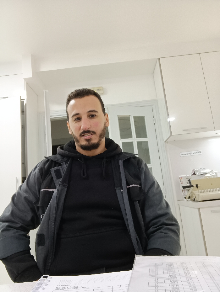 A person with short dark hair and a beard is seated at a desk. He wears a black hoodie under a gray jacket. The background features a white door with glass panels and white cabinets. Papers with typed text are visible on the desk in front of the person. A white appliance is on a counter to the right. The room is brightly lit.