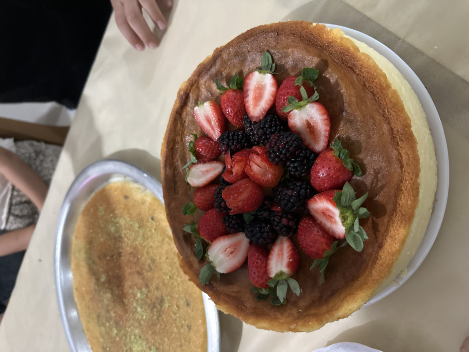 A baked cheesecake, adorned with fresh strawberries and blackberries, sits on a white plate. Beside it is a round metal tray filled with a pastry, possibly kanafeh, sprinkled with green nuts. The surfaces below are covered with beige fabric. Hints of people, including hands and clothing, are visible around the sides of the image.