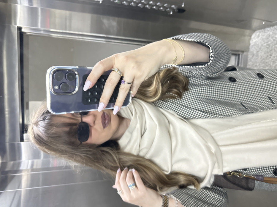 A person is depicted in a mirror selfie taken inside an elevator. The subject has light brown hair with bangs, wears small, dark rectangular sunglasses, and dark, glossy lipstick. They are dressed in a beige-colored scarf and a black and white checkered blazer with black buttons. The subject's right hand (viewer's left), holding a silver/dark gray iPhone in a clear case with a black textured grip, features light pink nail polish, a ring with a purple stone on the ring finger, and a ring with small clear stones on the middle finger. The subject's left hand (viewer's right) also has light pink nail polish and a ring with a prominent light blue stone on the middle finger. Multiple bracelets are worn on the left wrist, including clear beads, a patterned band, and delicate gold chains; two additional thin gold chain bracelets are visible on the same wrist. A brown leather bag with a gold chain strap and a tassel is partially visible on the subject's right side. The environment consists of reflective metal panels, typical of an elevator interior, showing vertical seams and reflections of control panel elements. The specific location within the city of Tbilisi, Georgia, is not discernible from the visual information provided.