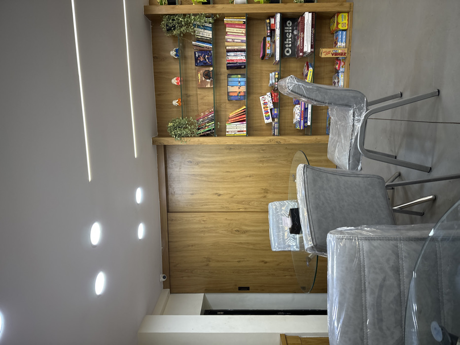 This image captures an indoor commercial or communal space located in the city of Shahapur, India. The area features a light grey floor and a white ceiling illuminated by multiple circular recessed lights and two linear LED strip lights. A white security camera is mounted on the upper left wall, above light brown wooden paneling that appears to be a sliding door system. In the midground, a circular glass-top table is present, surrounded by three visible grey upholstered chairs with silver metal legs. All chairs are covered in clear protective plastic sheeting. A black tissue box rests on the table. A portion of another circular glass-top table is visible in the immediate foreground. To the right, a floor-to-ceiling wooden shelving unit with glass shelves displays a collection of books, various board games (including "Othello" and "Champion"), and decorative items such as small figurines and artificial trailing plants. No individuals are present in the scene.