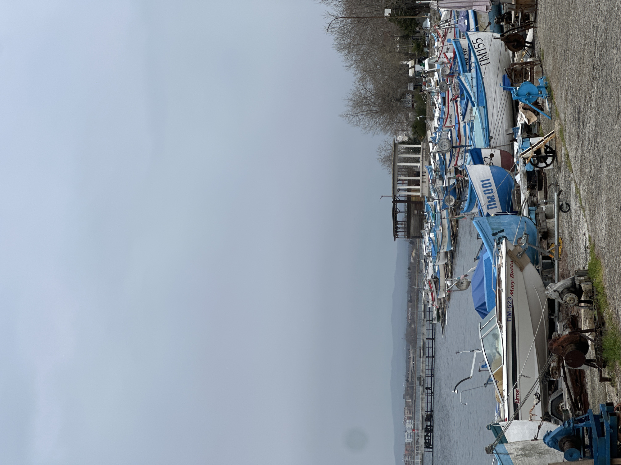 row of boats lined up on a concrete pier in Pomorie, Bulgaria. The boats are mostly small fishing vessels, with a mix of blue and white colors. Some boats have Bulgarian lettering on their sides. The pier is on the edge of a body of water, with a distant cityscape visible across the water. The sky is overcast and gray. Various pieces of equipment such as winches and rusty parts are seen alongside the boats. Bare trees are visible in the background. A building with columns is also seen in the background.