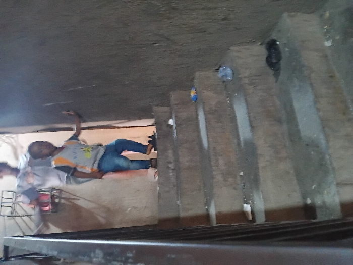 The scene depicts an interior concrete staircase in Sabon Gari East, Nigeria