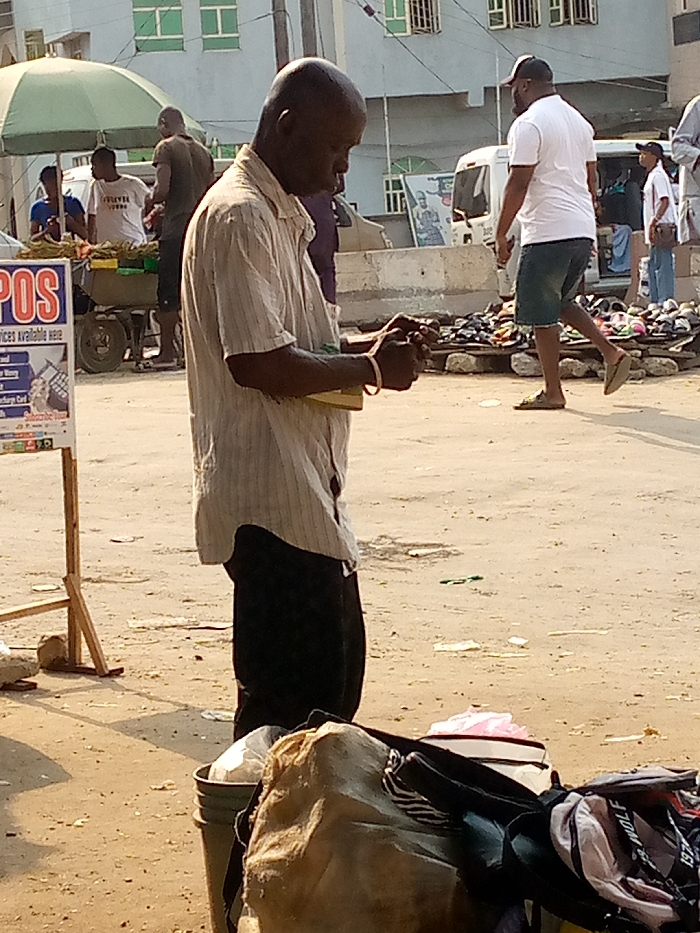 The image depicts a bustling outdoor street market scene in Rumuodumaya, Nigeria. The ground is an uneven, light brown dirt surface with scattered debris. In the immediate foreground, slightly left of center, a balding adult male with dark skin, wearing a light-colored, vertically striped short-sleeved collared shirt and dark trousers, stands in profile, facing right. He is focused on a small, light-colored rectangular object, possibly a book or electronic device, held in his hands. A light-colored band is visible on his right wrist. At his feet, a dark bucket, a large tan bag, and an open dark bag containing items, including a white and pink box, rest on the ground. To his left, a white rectangular sign displaying "POS" in red capital letters and "SERVICES AVAILABLE HERE" is mounted on a wooden stand. In the middle ground to the left, under a large green market umbrella, a wheeled cart is visible, laden with green leafy produce. At least two individuals are present near the cart; one male in a white t-shirt with "FOREVER" printed on it is positioned behind the cart. To the right of the main subject, an adult male with dark skin, wearing a white short-sleeved t-shirt, dark shorts, and sandals, walks from left to right, captured mid-stride. He wears a dark baseball cap. Beyond him, a collection of various shoes and sandals are displayed directly on the ground, seemingly arranged on a low concrete or stone barrier. The background features light-colored multi-story buildings with green-framed windows, indicating an urban environment. A white van is partially visible in the mid-background, and another white vehicle is further back. A large poster or banner featuring a person's image is affixed to a concrete structure or wall. Several other individuals are dispersed throughout the background, engaged in various activities, consistent with a public market setting. The scene is illuminated by natural daylight.