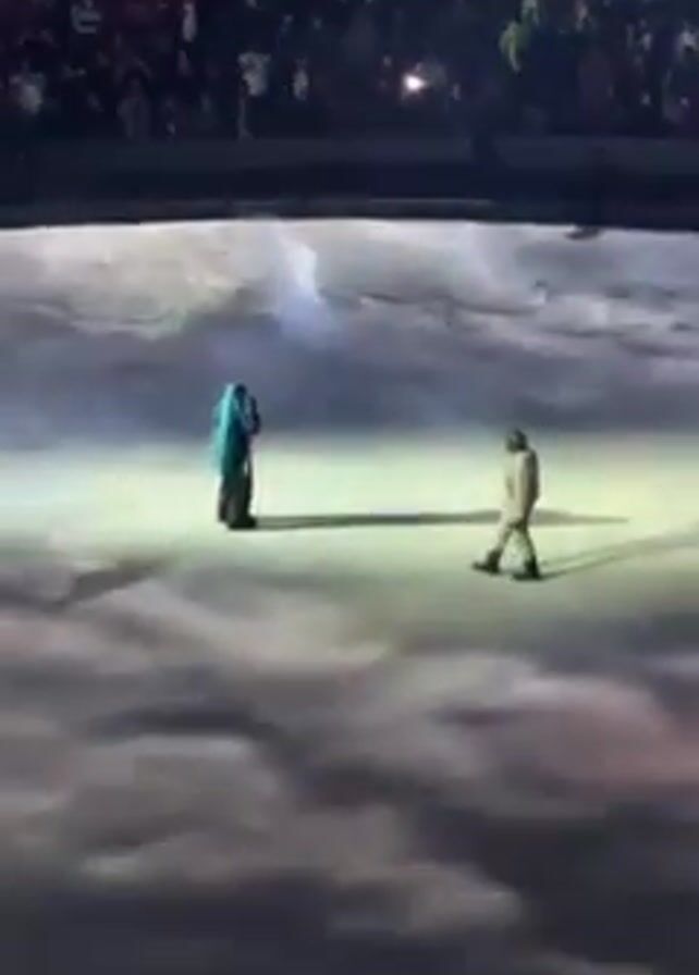 Here is a brief description of the video: The video shows two people standing on a stage covered with a cloud-like effect. The person on the left is wearing a blue-green robe, while the person on the right is in a tan or white outfit. They are in a stadium with a crowd in the background. The video then abruptly cuts to a dark background with streaks of light and a close-up of a person's face.