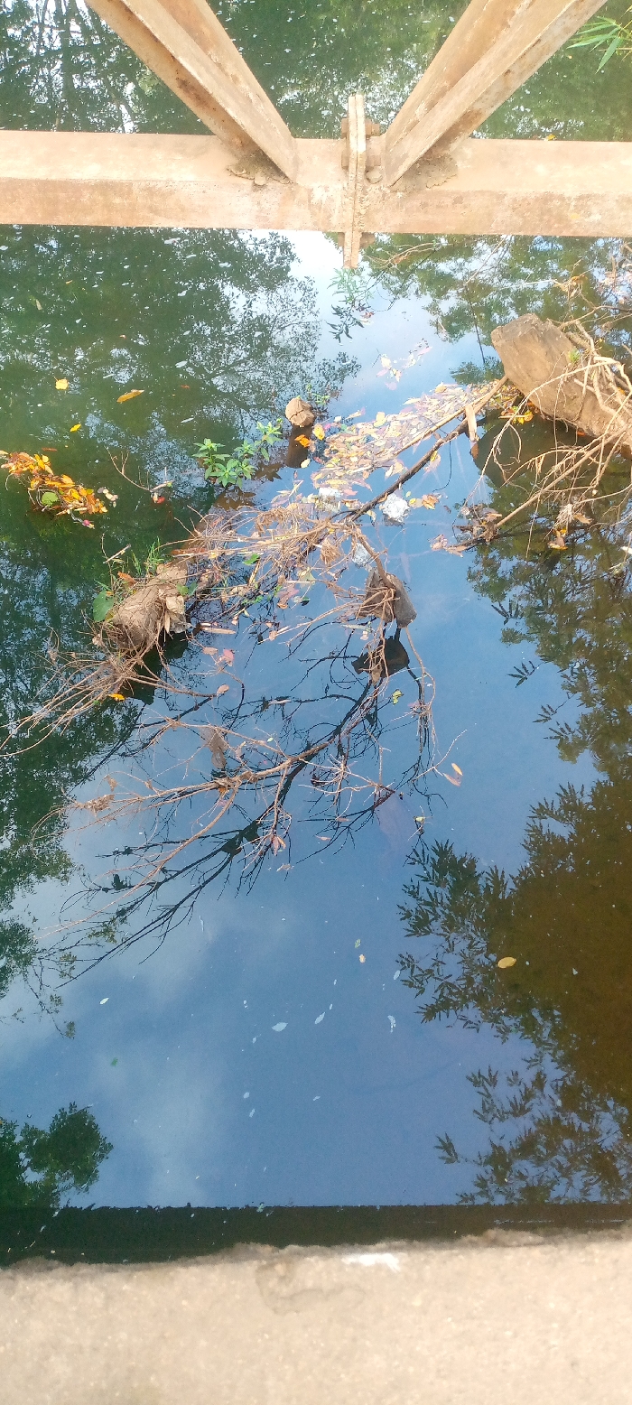 A murky pond is filled with debris, including a fallen tree branch, leaves, and other organic matter. The water reflects the surrounding trees and sky, creating a distorted and somewhat surreal image. A concrete structure frames the top and bottom of the scene, adding a stark contrast to the natural elements.