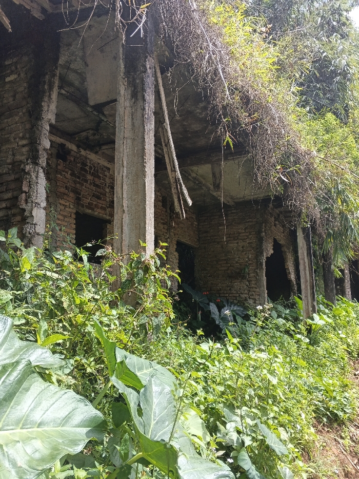 A decaying brick and concrete structure succumbs to nature. The skeletal remains of a building feature weathered pillars, collapsed roofing, and hollow window openings. Overgrowth consumes the scene, with lush green foliage obscuring much of the dilapidated edifice. Vines drape from the crumbling ceiling, blending architecture with the wild landscape. A sense of abandonment and ruin prevails.