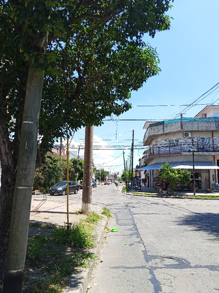 A street scene with a tree on the left. The street runs away from the viewer, lined with buildings and parked cars. Power lines crisscross overhead. The road surface is cracked and patched. Green grass grows on the curb. The sky is blue with some clouds. Two utility poles are prominent in the foreground.