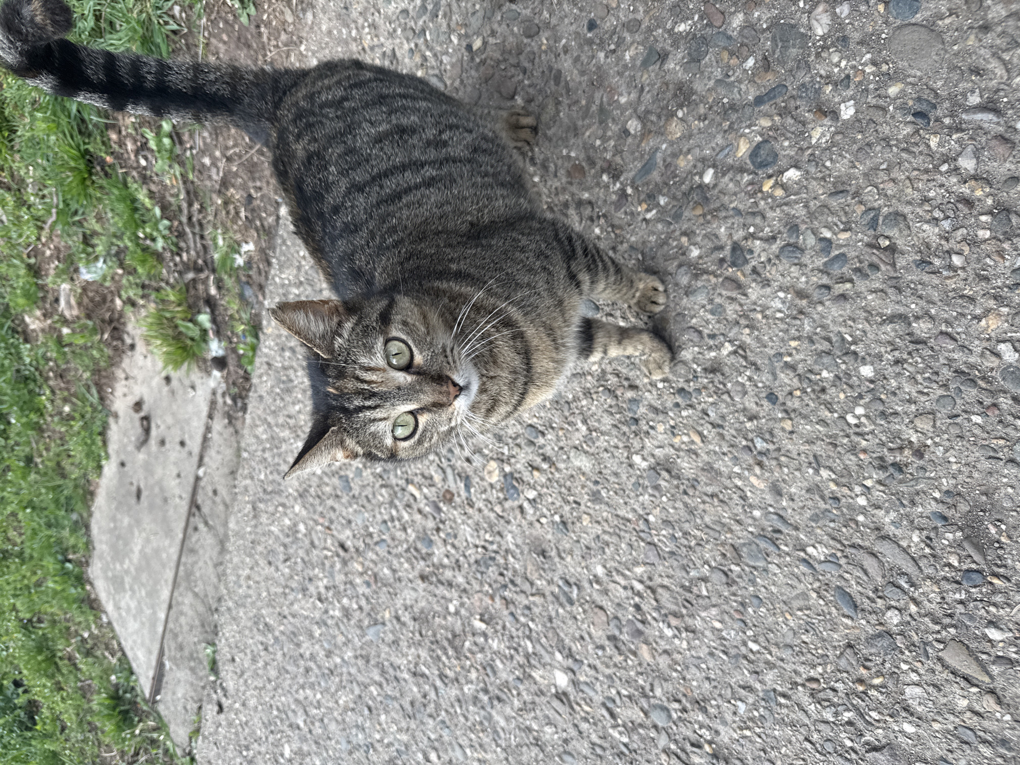A tabby cat lies on a concrete surface. The cat is predominantly grey with dark stripes and has green eyes. The surface it lies on is grey, and textured, possibly a sidewalk. Grass and other greenery are visible at the edge of the concrete, suggesting an outdoor location. Specific location in Vratsa, Bulgaria, is not discernible.