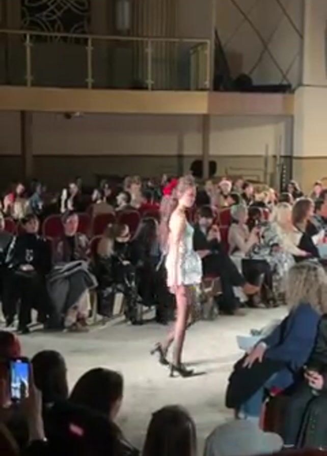 A woman in a short white floral dress, black tights, and heels walks down a runway at a fashion show