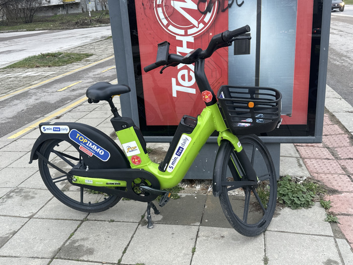 - "A bright green and black electric bicycle is depicted parked upright on a concrete tiled sidewalk in Varna, Bulgaria" by FM-GJEOS2, licensed under CC BY 4.0