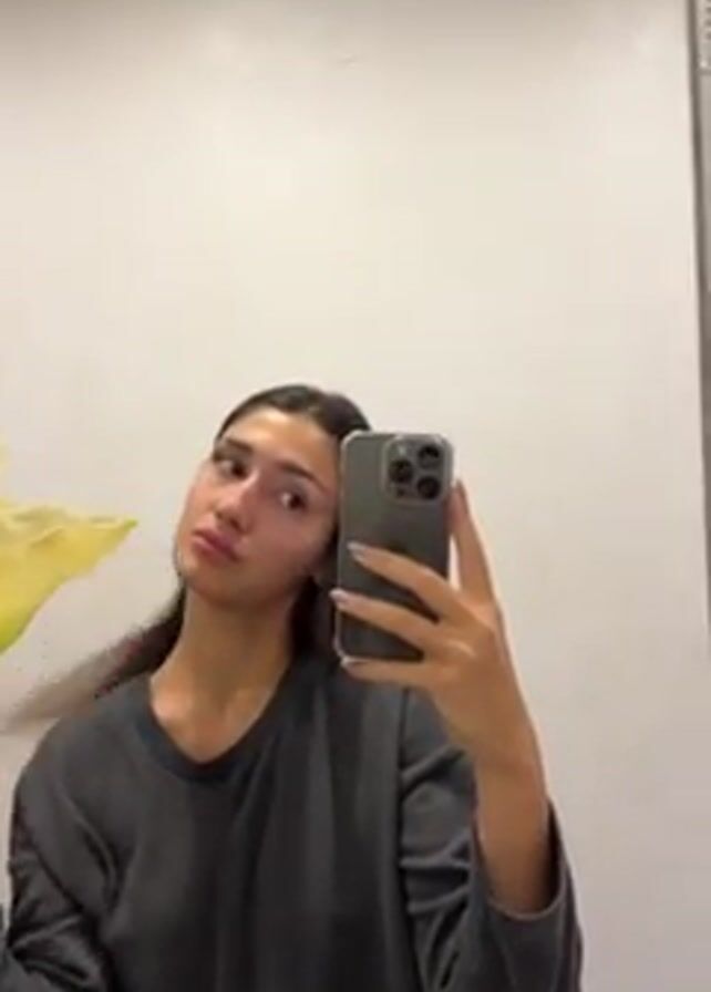 A young woman in a gray long-sleeved shirt stands in front of a mirror, taking a selfie with her phone