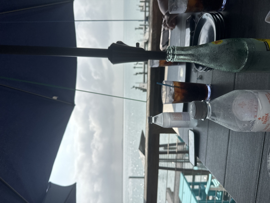 This image depicts an outdoor dining patio in South Padre Island, United States of America, offering a view of a body of water under a cloudy sky. The scene is observed from a dark, slatted table, largely shaded by a prominent dark blue umbrella. On the table, from left to right, are a partially consumed plastic bottle of Acqua Panna water with visible condensation, a white plastic water bottle, a tall clear glass containing a dark beverage with ice and a blue straw, and a clear glass bottle with condensation (likely Topo Chico). A black smartphone and a white smartphone are also present on the table, alongside a stack of dark plates. The hands of at least two individuals are partially visible on the right side of the table. Beyond the table, a wooden railing separates the patio from the water, with turquoise outdoor chairs and a table visible on a lower deck level. The background features a wide expanse of water reflecting light, leading to a distant landmass on the horizon and several dock-like structures extending into the water on the right.