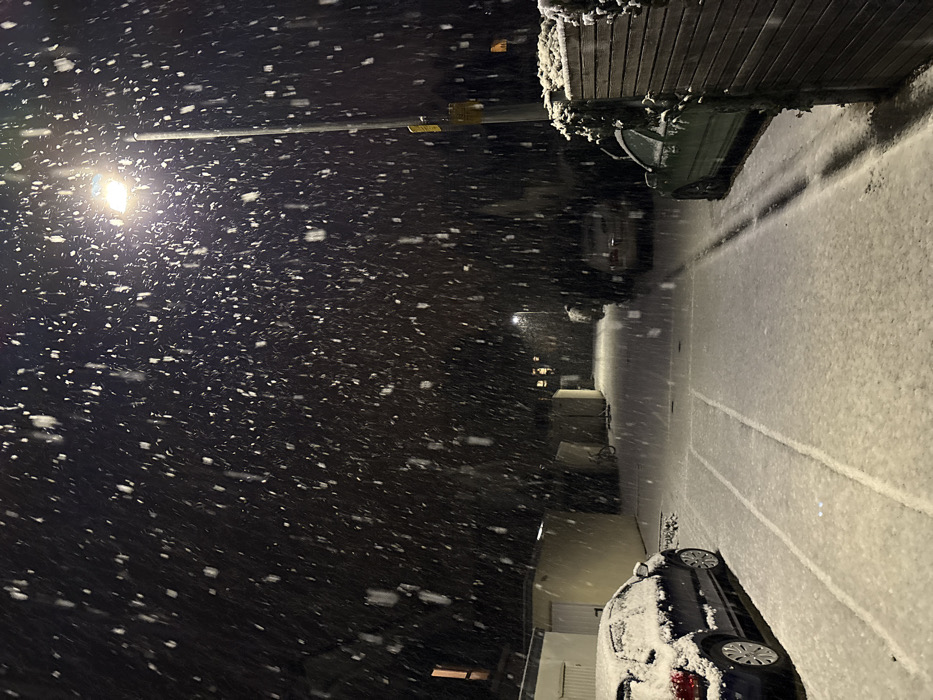 Night scene with heavy snowfall illuminated by a street lamp. Snowflakes fill the dark sky. A snow-covered road is visible, alongside parked cars also blanketed in snow. A wooden fence or structure is on the right, laden with snow. The scene conveys a sense of quiet isolation during a winter storm.