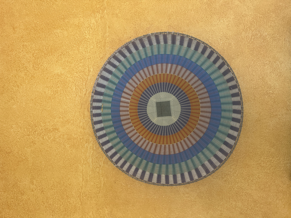 A woven, circular mat dominates the upper right corner against a textured, golden-yellow background. The mat features concentric rings of alternating colors including brown, blue, green, and gray. A square pattern occupies the center. Its outer edge has a repetitive vertical pattern of gray and a darker shade. The background wall has an uneven, mottled texture.