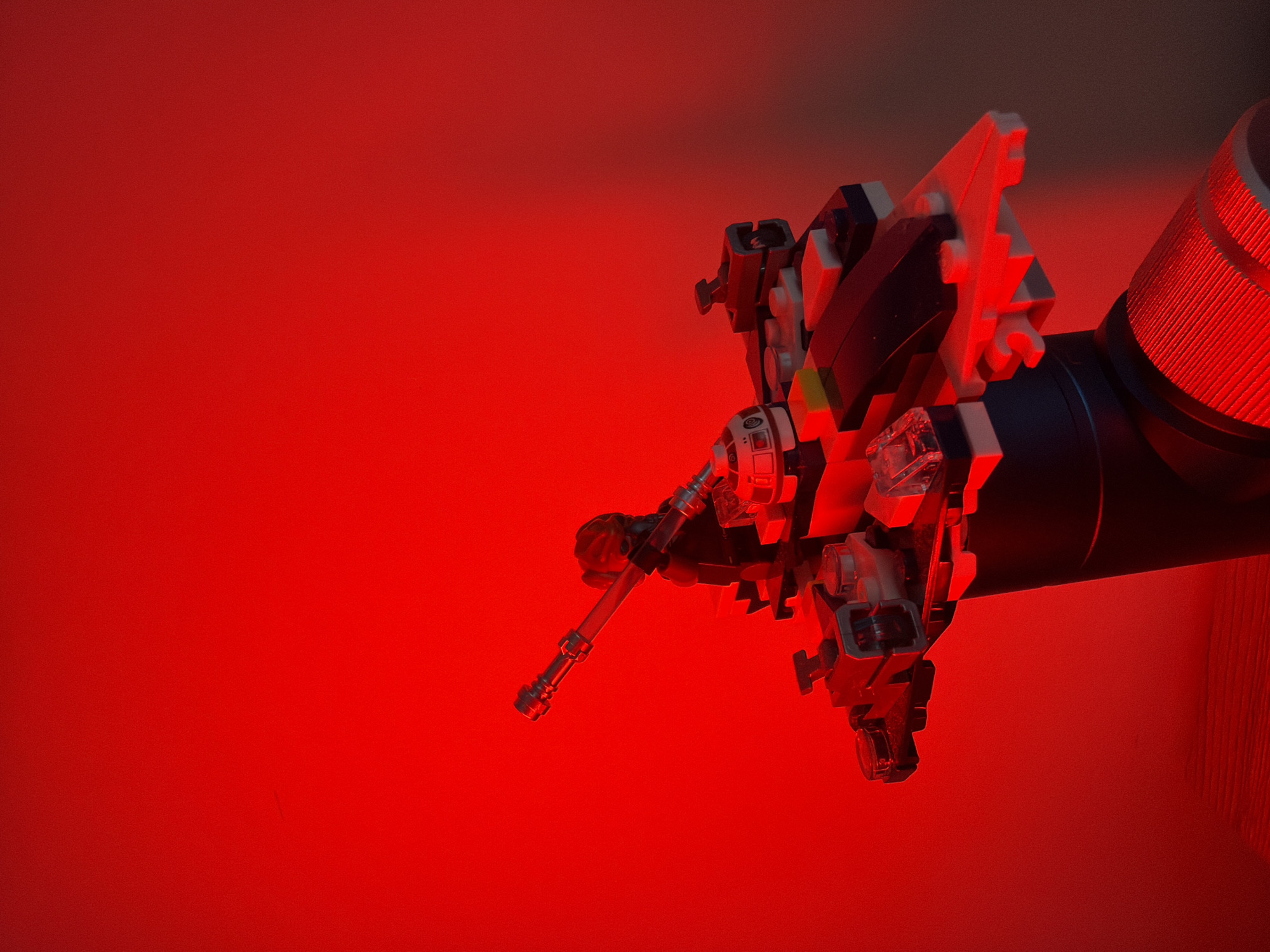 The image displays a detailed LEGO model of a futuristic spacecraft or vehicle, set against a solid red background. The scene is illuminated by a strong, uniform red light source, casting a monochromatic red hue over all visible elements. The LEGO model, positioned in the lower-middle of the frame, is predominantly constructed from black, dark grey, and white bricks. It features a central fuselage with angled wings or stabilizers extending outwards. A transparent clear element serves as a cockpit canopy. Towards the rear-top, a cylindrical gun turret with a long, silver-colored barrel is mounted, angled upwards and to the left. A small, domed white and grey LEGO droid head, resembling an R2-D2 unit, is visible on the upper left section of the model. The LEGO model rests on a vertical, black cylindrical object, which is partially visible at the bottom of the frame. This cylinder connects to a larger metallic object with a textured, ridged surface, visible in the lower right, also bathed in red light. This object appears to be a stand or support for the LEGO construction. The background is a flat, featureless wall, evenly saturated in bright red light, creating a stark contrast. No human figures are present. The environment appears to be an indoor setting. This scene is located in the city of Burgas, Bulgaria.