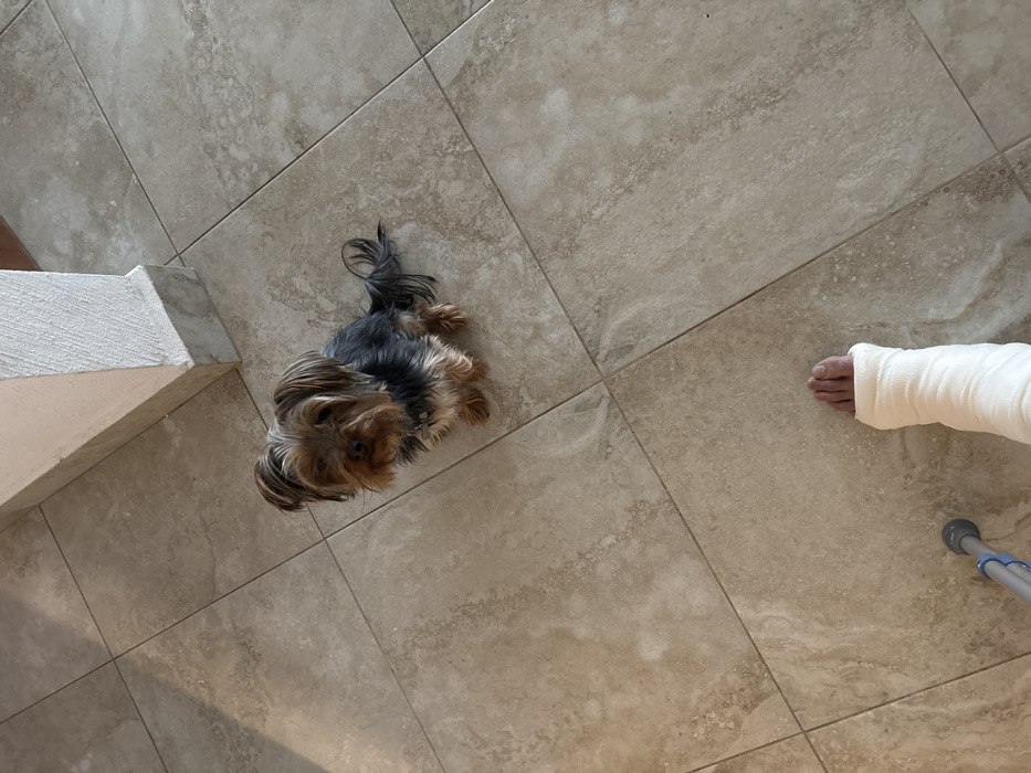 A high-angle shot on tiled flooring shows a Yorkshire Terrier looking up. Nearby, a person’s lower leg is encased in a white cast, with a blue crutch visible. The tiles are light beige with mottled patterns. A small portion of a white wall is visible on the left. The dog is positioned between the wall and the person with the cast.