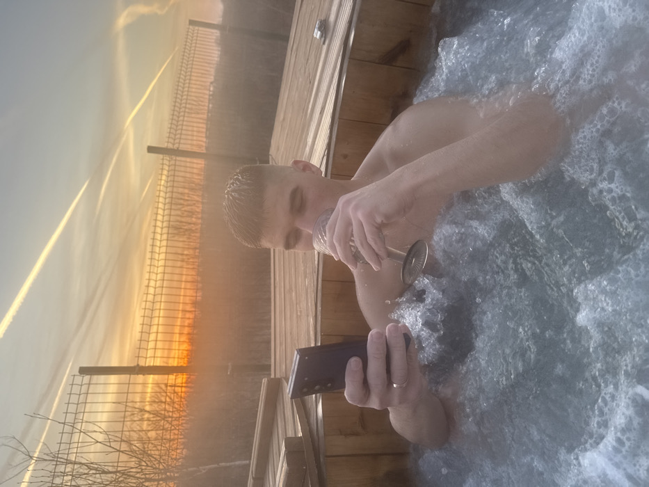 - "An outdoor scene in Căciulați, Romania, depicts an adult male partially submerged in an active, bubbling wooden hot tub during golden hour, characterized by an orange and blue sky with visible aircraft contrails" by FM-uEVzD3, licensed under CC BY 4.0