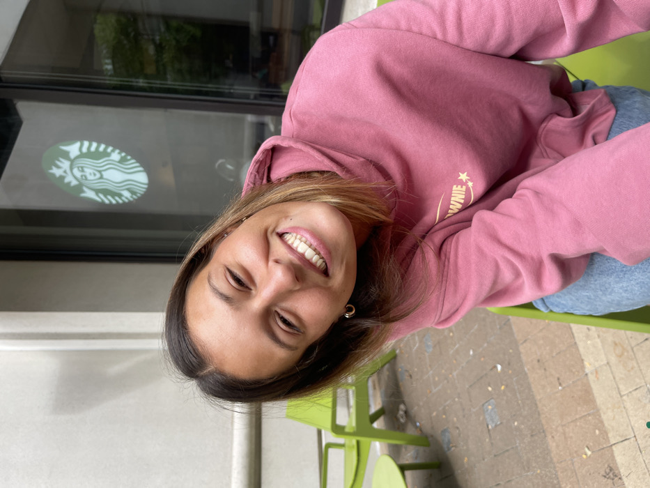 A female subject is depicted from the chest up, positioned slightly off-center to the left, smiling broadly directly at the camera with her head tilted. She has medium-length brown hair, brown eyes, and medium skin tone. She wears a pink hooded sweatshirt featuring a light-colored "BROWNIE" and star graphic on the left chest, light blue jeans, and small hoop earrings in both ears. In the background, a prominent green Starbucks siren logo is visible on a glass window or door, indicating a Starbucks establishment. To the subject's left, two bright green patio chairs and a circular green table are present on a paved ground composed of light-colored rectangular pavers. The scene is an outdoor patio area adjacent to a building, presumably the Starbucks, located in Arlington, United States.