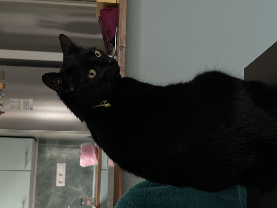 - "A black cat with yellow-green eyes and a patterned light-colored collar sits upright on a dark brown wooden surface" by FM-D8nzh1, licensed under CC BY 4.0