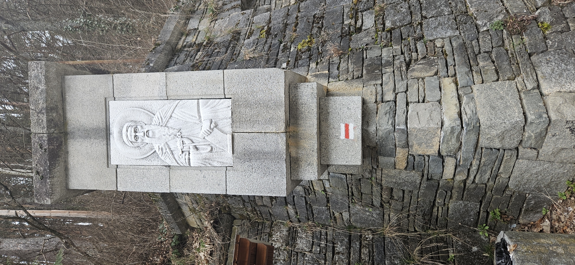 The image displays a gray stone monument located in the vicinity of Rila Monastery, Bulgaria. The central feature is a vertical, tiered monument constructed from cut gray stone blocks. Embedded within its upper section is a white rectangular relief carving depicting a bearded male saint with a halo, wearing a monastic robe, holding a large key in his left hand and a rolled scroll in his right. Below the carving, a horizontal stone block bears a painted hiking trail marker: a white rectangle with a central horizontal red stripe. The monument stands in front of a weathered dry-stacked stone retaining wall, which exhibits some moss growth and sparse, dry vegetation. To the immediate left of the monument's base, a small wooden overhang or structure is partially visible, and a black plastic bag rests on the ground next to a small stone block. The background consists of a dense, leafless forest of deciduous trees, with some coniferous trees also present.
