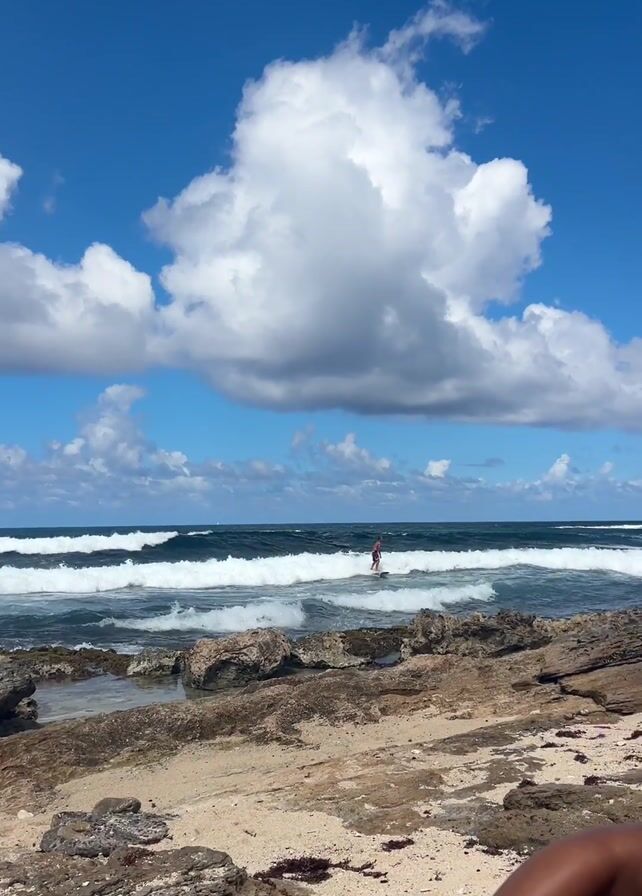 man surfing in a choppy ocean. The surfer is wearing dark swim trunks and is riding a wave towards the rocky beach. The sky is blue with puffy white clouds. The waves are white-capped and moderately sized. The beach is sandy and rocky with some sparse vegetation. The camera is positioned at a low angle, looking out over the beach towards the ocean. The video captures the movement of the surfer and the waves, as well as the scenic beauty of the beach and sky. A leg is visible in the foreground, presumably belonging to the videographer.