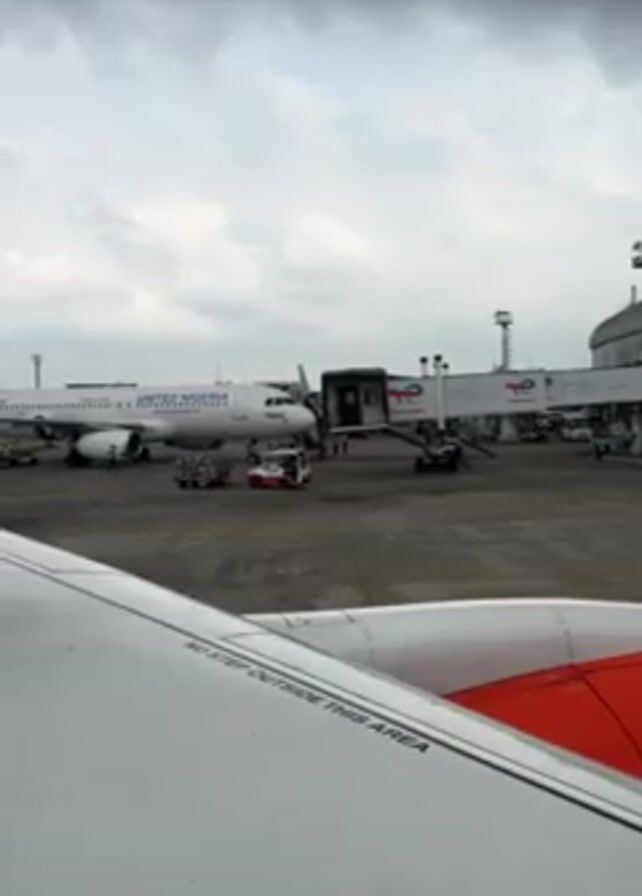 n airport tarmac on an overcast day. A large white airplane with "UNITED NIGERIA" printed on the side is parked at a jet bridge. There are several small vehicles and a few people moving around the plane. The video is taken from the window of another airplane, with a portion of its wing visible in the foreground. The wing is white with an orange tip and has the text "NO STEP OUTSIDE THIS AREA" printed on it.