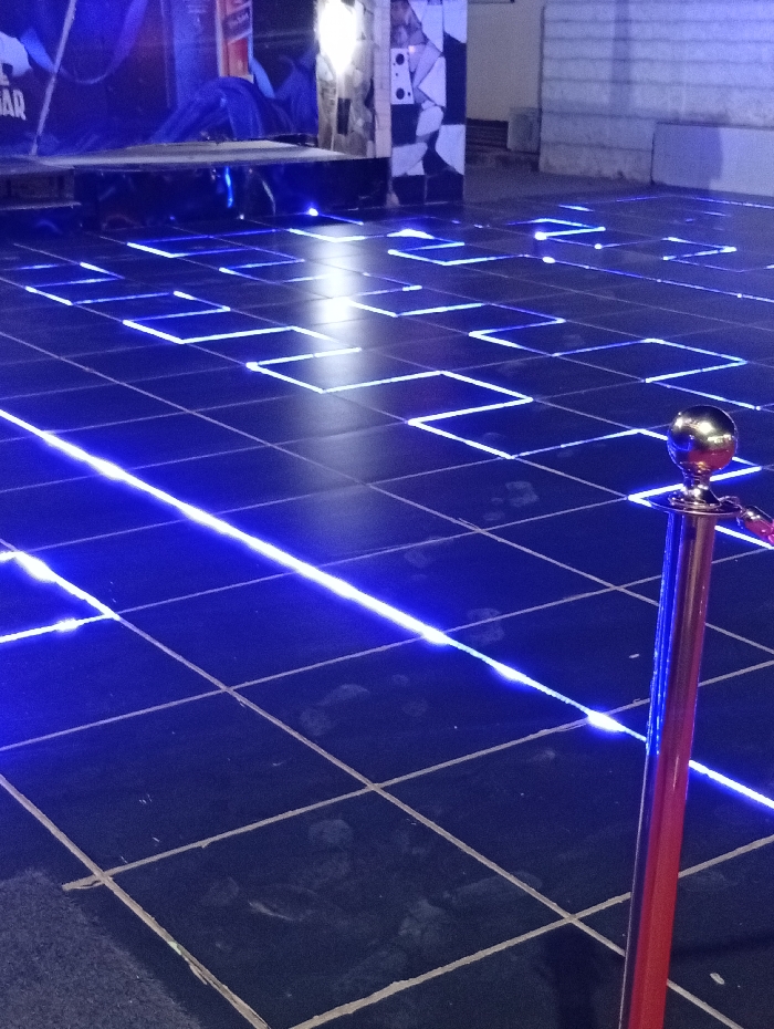A dark-tiled floor is brightly lit with blue neon lights in a geometric grid pattern, leading toward a stage