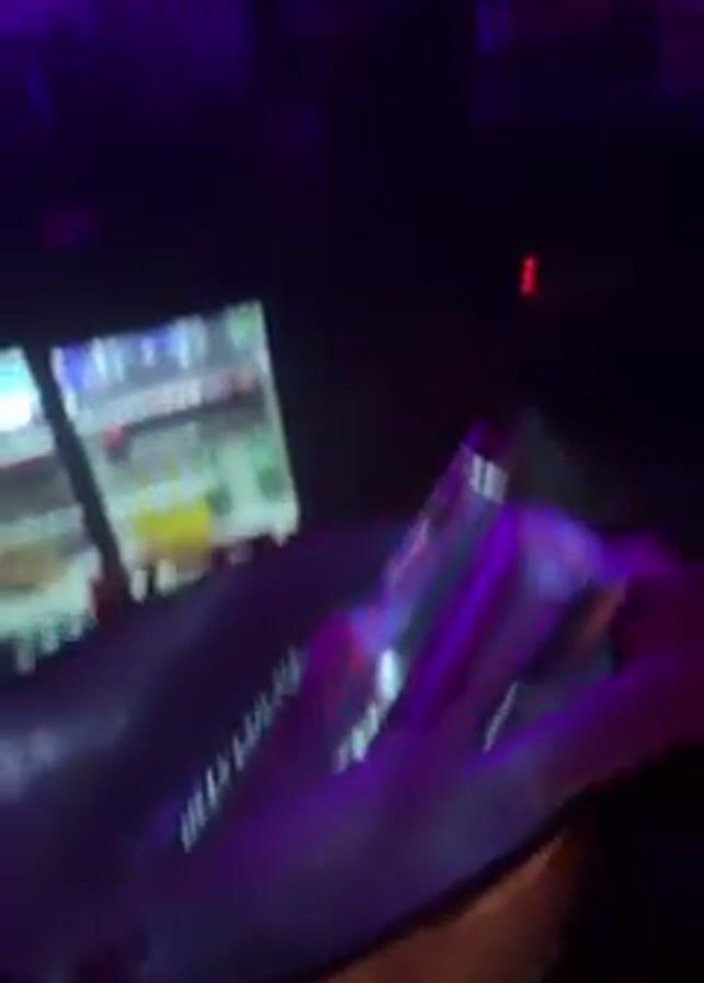 crowded nightclub illuminated with purple and red lighting. The camera pans up from a table with an ice bucket filled with drinks to show the dance floor with many people dancing in a dark and energetic atmosphere. There is a DJ booth where a person is likely playing music. Overall, the scene suggests a lively nightlife setting.