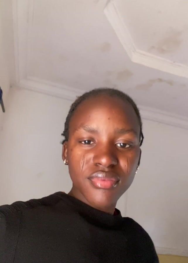 A young woman with dark skin, wearing a black shirt, looks directly at the camera and smiles. She has small hoop earrings in her ears. Her hair appears to be pulled back. The background is a white ceiling with some water stains and white walls. A corner of what appears to be a yellow wall is visible.