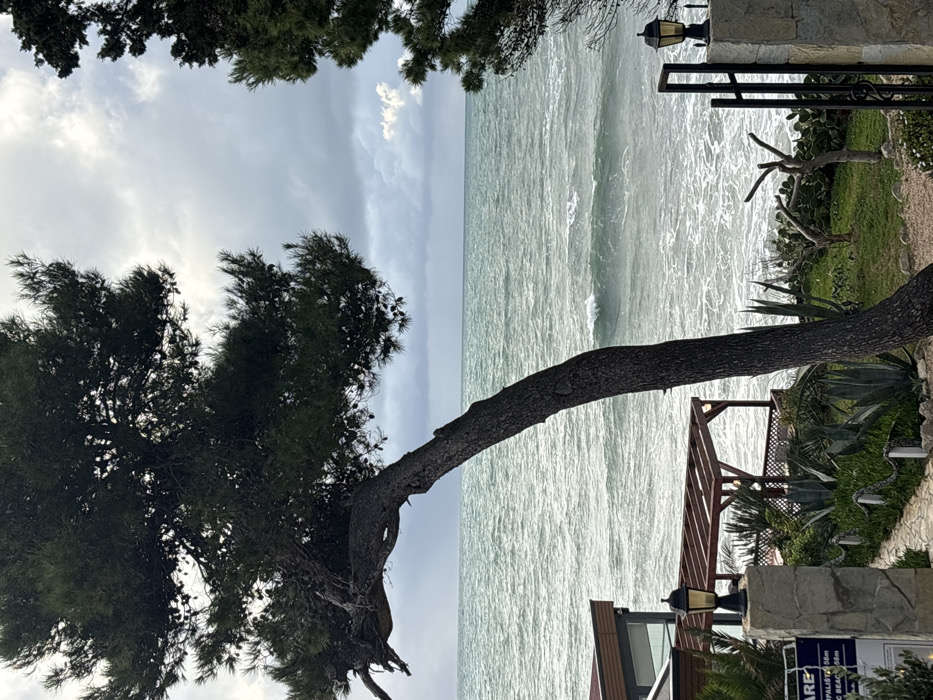 The image depicts a coastal scene in Ulcinj - Ulqin, Montenegro, observed under an overcast sky. A large pine tree with a thick, dark trunk, prominently leaning to the left, occupies the central foreground, displaying dense green foliage and visible pinecones. To the left of the tree, a modern building structure with a dark roof and large windows is partially visible, adjacent to a wooden pergola. A stone pillar with a black metal lantern stands by a tiled pathway, featuring a blue sign displaying partial text: "CARE," "PALISHTE 50m," and "BEACH 50m." The immediate foreground ground cover includes green grass, large agave plants, and scattered shrubs. To the right, another stone pillar with a matching black metal lantern and a dark metal gate mark an entrance or boundary. The midground shows the choppy, turquoise-grey sea with numerous white-capped waves. The background is composed of a cloudy, predominantly grey sky exhibiting slight variations in light intensity. No individuals are present in the scene.