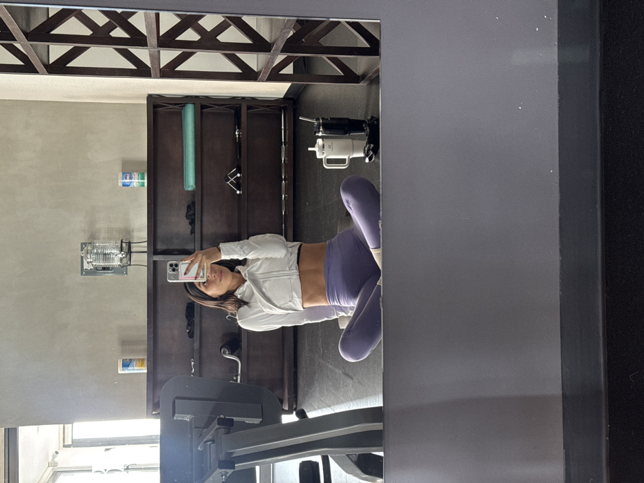 An individual is depicted in a mirror selfie taken within a fitness facility in Interlomas, Mexico. The person, a female with dark hair and a black headband, is seated cross-legged on a dark floor. She wears a white cropped long-sleeved athletic top, exposing her abdomen, and light purple athletic leggings with white socks. She holds a light-colored smartphone with a clear case and a multi-colored insert, positioned to capture her reflection. To her right on the floor are a white tumbler with a handle and a black tumbler with a straw, alongside a pair of black wireless earbuds in their case. The background shows a light grey textured wall behind a dark wooden, multi-tiered shelving unit. On the top shelf, two containers of blue and white disinfectant wipes are visible. The middle shelf holds black hand wraps, a teal yoga mat, and small black weights. A glass water dispenser on a metal stand is mounted on the wall above the shelving. To the far left, a portion of a grey gym machine is visible. On the far right, a dark wooden lattice structure is reflected. The lighting is bright, indicating an indoor environment likely illuminated by natural and artificial sources.