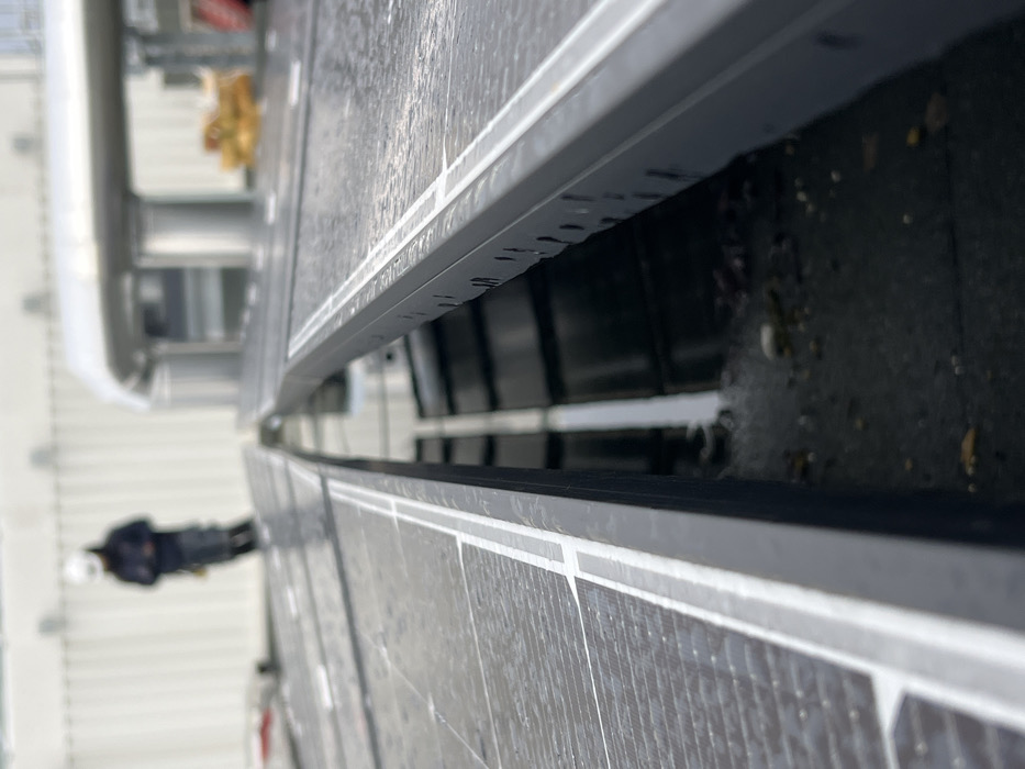 A low-angle forensic image depicts a rooftop scene in Villeneuve-d'Ascq, France. In the immediate foreground, two parallel rows of dark-colored solar panels extend into the midground. Their surfaces are wet, exhibiting numerous water droplets and streaks. Each panel features a multi-cell grid pattern framed by light grey edges. A central gap, approximately 10-15 centimeters wide, separates these two rows, revealing a dark, wet surface beneath that contains small debris, including leaves, dirt, and tiny stones. In the blurred midground, a single individual stands, oriented away from the viewer or slightly to the side. This person wears a white hard hat, a dark jacket, dark trousers, and dark footwear. They appear to be holding a small object in their hands, consistent with an inspection or work activity. The background consists of a light-colored, possibly corrugated metal wall or parapet, along with blurred metallic, cylindrical pipes or ventilation units, and faint yellow bundled materials, all under diffused, overcast lighting.