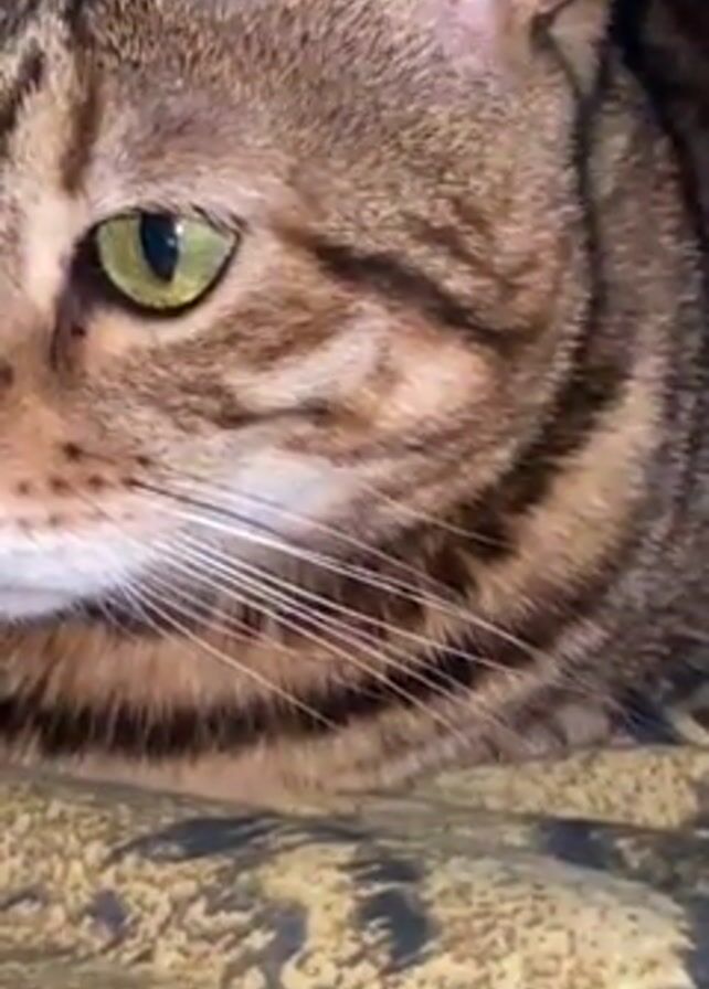 close-up of a Bengal cat's face resting on a patterned surface. The cat has green eyes, brown and black striped fur, and white whiskers. The cat looks to the right, then slightly adjusts its gaze.