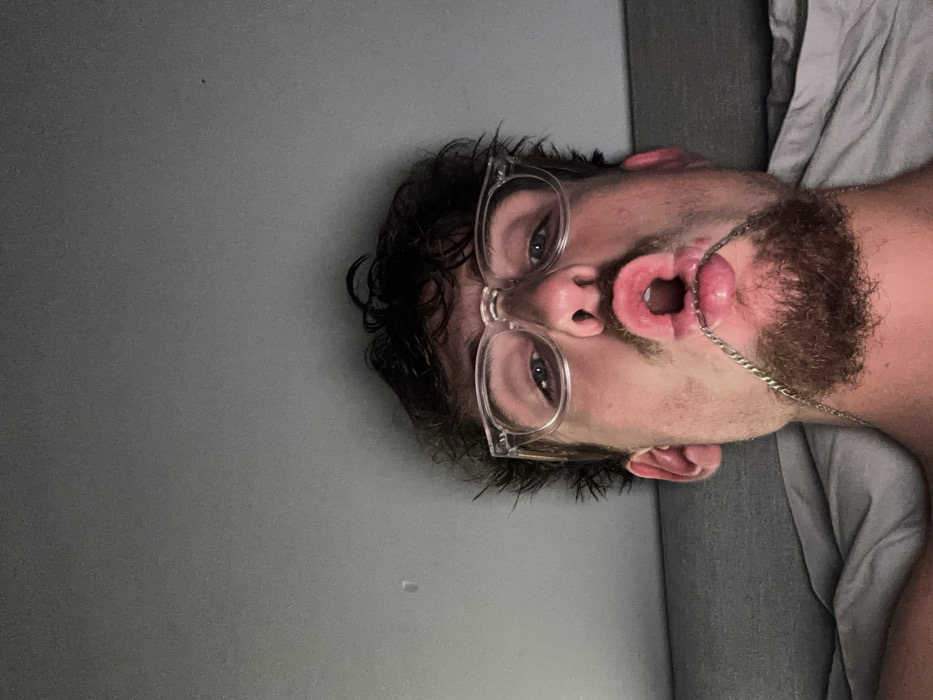 A man with a beard and clear-framed glasses stares directly at the camera, his mouth formed into a wide, exaggerated "O" shape. He has curly brown hair and a gold chain visible around his neck. The photo is taken from a low angle, with the man lying down. He is positioned on a light grey background, either a wall or bedding. The overall lighting is somewhat dim.