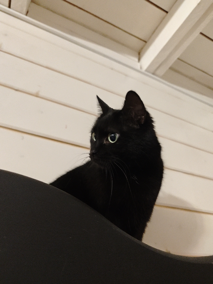 - "A black domestic cat is captured in a close-up, low-angle shot within an interior location in Свистуха (кузяевский С/о), Russia" by FM-P9SdV2, licensed under CC BY 4.0