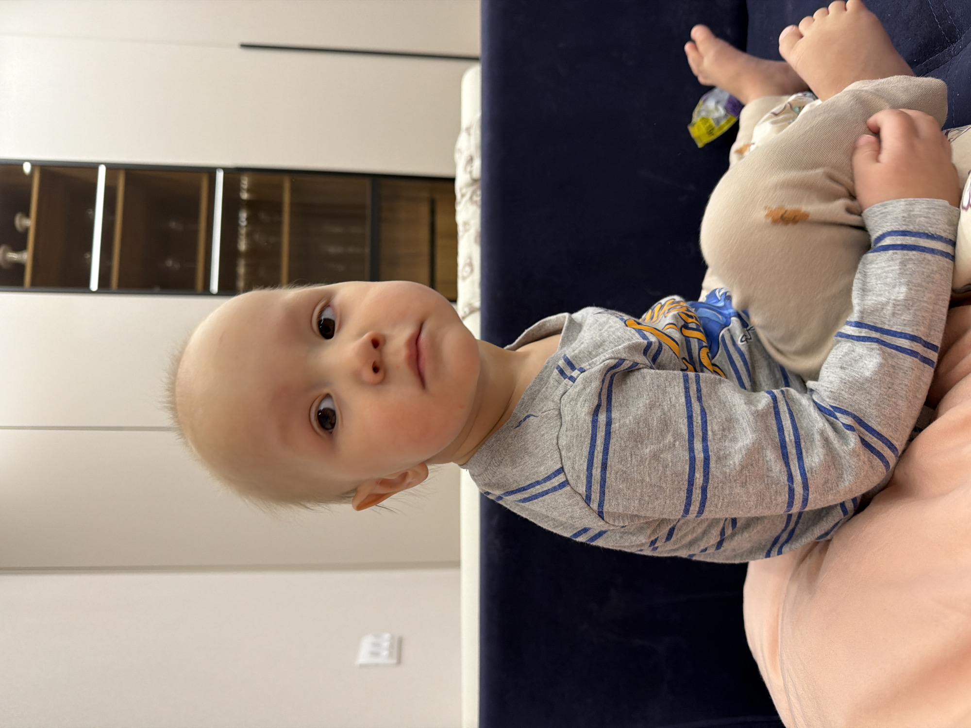The image depicts a young child seated on a dark blue upholstered couch in an indoor, residential setting within the city of Chaikovsky, Russia. The child, appearing to be a toddler with light hair and fair skin, is centrally positioned, looking directly forward with a neutral expression. The child wears a grey long-sleeved shirt with blue horizontal stripes and light tan trousers, which bear a prominent brown stain on the upper left thigh. A light pink cushion or blanket is beneath the child on the couch, and bare feet are visible to the right. In the background, a plain light-colored wall is visible to the left, featuring a white electrical outlet. To the right, a tall, narrow cabinet with a dark frame and glass-fronted shelves is present, displaying several decorative items or glassware. A yellow and purple snack wrapper is visible on the couch near the child's feet. The overall environment suggests a modern domestic interior.